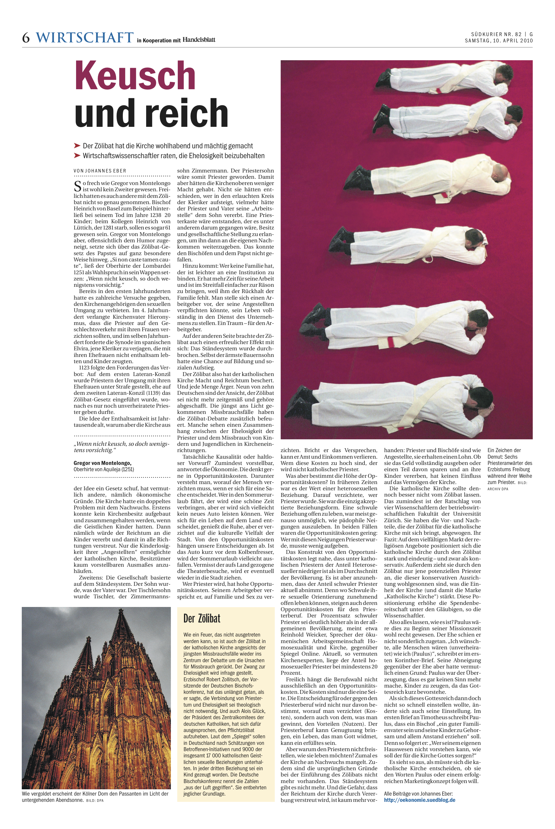 Wer Priester wird, hat hohe Opportunitätskosten. Seinem Arbeitgeber verspricht er, auf Familie und Sex zu verzichten. Bricht er das Versprechen, kann er Amt und Einkommen verlieren. Wem diese Kosten zu hoch sind, der wird nicht katholischer Priester.