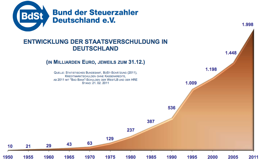 Deutschland lebt bekanntermaßen über seine Verhältnisse. Von wenigen Jahren abgesehen, gibt der Staat seit 1970 jährlich mehr aus als er einnimmt. Die Folge ist eine stetig wachsende Staatssverschuldung (siehe Grafik).