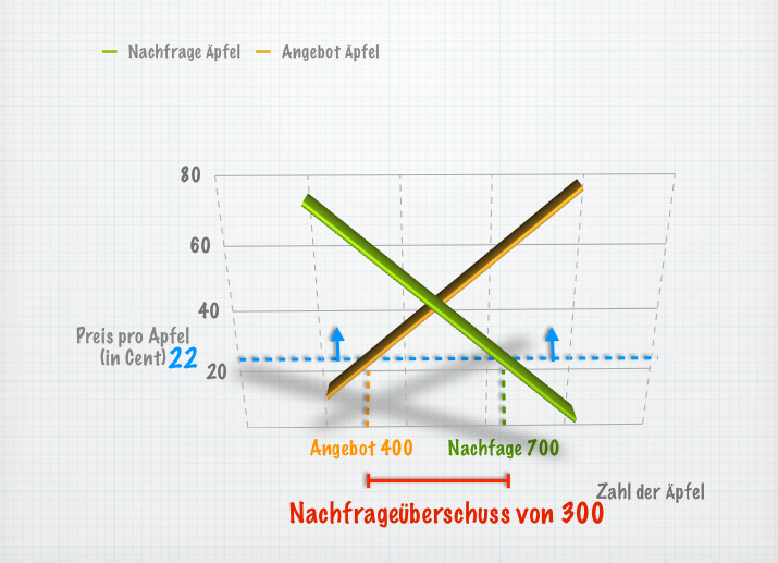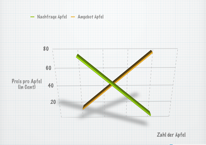 Der letzte Schritt zum Preis: das Angebot. Damit ein Geschäft zustande kommt, braucht es zwei. Ohne vertiefend auf die Entstehung der Angebotskurve zu sprechen zu kommen, an dieser Stelle nur so viel: Die Angebotskurve verhält sich zur Nachfragekurve gegensätzlich; je höher der Preis, desto mehr Anbieter sind bereit, Äpfel zu verkaufen.