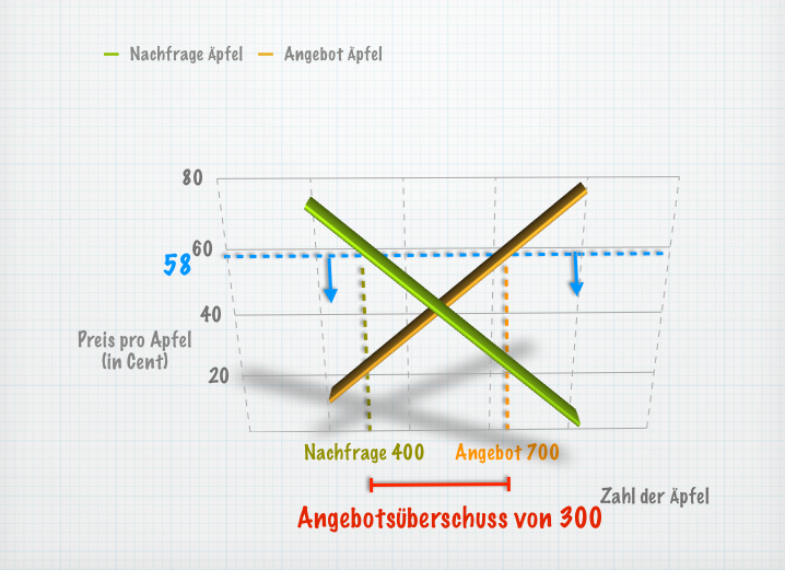 Wie kommt es zu diesem markräumenden, wie von unsichtbarer Hand geleiteten, Marktpreis? – Ist der Preis zu hoch, gibt es mehr Anbieter als Nachfrager, also einen Angebotsüberschuss. Die Anbieter, die ihre Ware nicht loswerden, werden den Preis senken, soweit, bis die gesamte Ware verkauft ist.