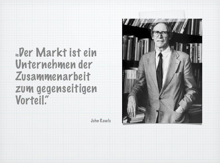 Warum finden liberale Ökonomen den Markt eigentlich so toll? Weil dort ein Geschäft nur dann zustande kommt, wenn es beiden Seiten hilft. Win-Win-Situation heißt das heute häufig. Der amerikanische Philosoph John Rawls hat es so gesagt: “Der Markt ist ein Unternehmen der Zusammenarbeit zum gegenseitigen Vorteil.”