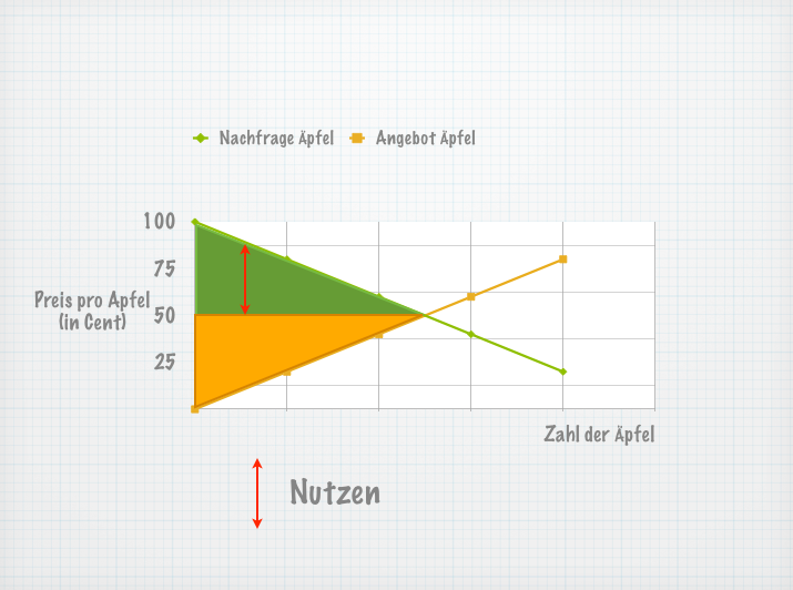 Bildschirmfoto 2013-03-03 um 09.27.06Dieses Wohlfahrtsdreieck ergibt sich auf dem Schaubild aus den beiden farbigen Dreiecken (grün und gelb). Diese zeigen den Wolfahrtsgewinn, den ein Markt erzeugt. Inwiefern? Die grüne Gerade bildet bekanntlich die aggregierten Zahlungsbereitschaften der Nachfrager ab. Es gibt keinen Nachfrager, der bereit ist, 100 Cent für einen Apfel zu bezahlen. Darunter beginnt die Nachfrage. Je geringer der Preis, desto mehr Menschen, die bereit sind, höchstens diesen Preis zu bezahlen. Der Punkt ist: Alle zahlen aber lediglich den Marktpreis von 50 Cent. Die Differenz von Zahlungsbereitschaft und Marktpreis ist der Nutzen des Geschäfts für den Nachfrager.