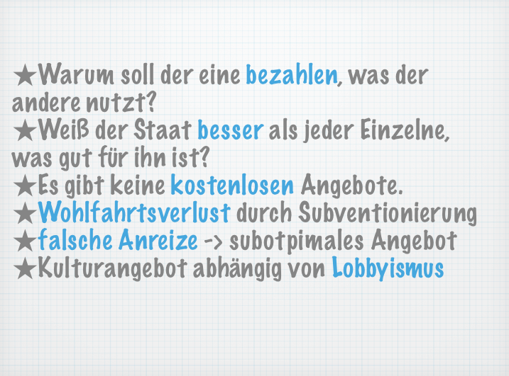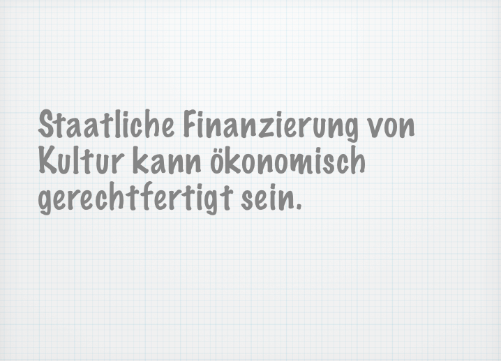 Fazit: Aus liberaler ökonomischer Perspektive kann es staatlich Kulturförderung grundsätzlich aus allen drei Gründen geben, wozu der Staat legitimiert ist: Der Staat als Produzent öffentlicher Güter, der Staat als Erfüllung sozialer Aufgaben sowie der Staat zur Internalisierung externer Effekte. Das freilich heißt nicht, dass jede Kulturförderung immer eines der drei Kriterien auch erfüllt. Wohl eher im Gegenteil, so meine Vermutung. Meine Einschätzung: Kulturförderung erfüllt häufig keines dieser Kriterien (was sie per Definition zur Subvention macht).