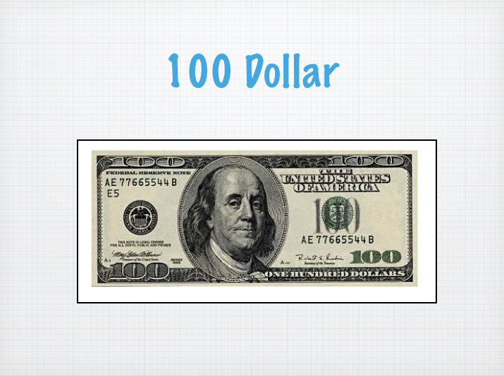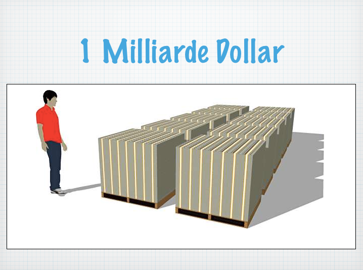 Ein nettes Beispiel, das ich nur in Dollar gefunden habe, veranschaulicht den Betrag.  Es werden zur Visualisierung der Summe ausschließlich 100 Dollar Noten verwendet. Genauso gut kann man sich 100 Euro-Scheine vorstellen.