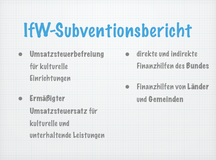 Wie groß ist die Summe der Subventionen (was Subventionen sind, dazu gleich mehr) für den Kulturbetrieb. Zunächst, woraus bestehen die Subventionen? Der Subventionsbericht des Instituts für Weltwirtschaft Kiel (IfW) listet sie auf: Umsatzsteuerbefreiung, ermäßigter Umsatzsteuersatz, direkte und indirekte Finanzhilfen von Bund, Länder und Gemeinden.