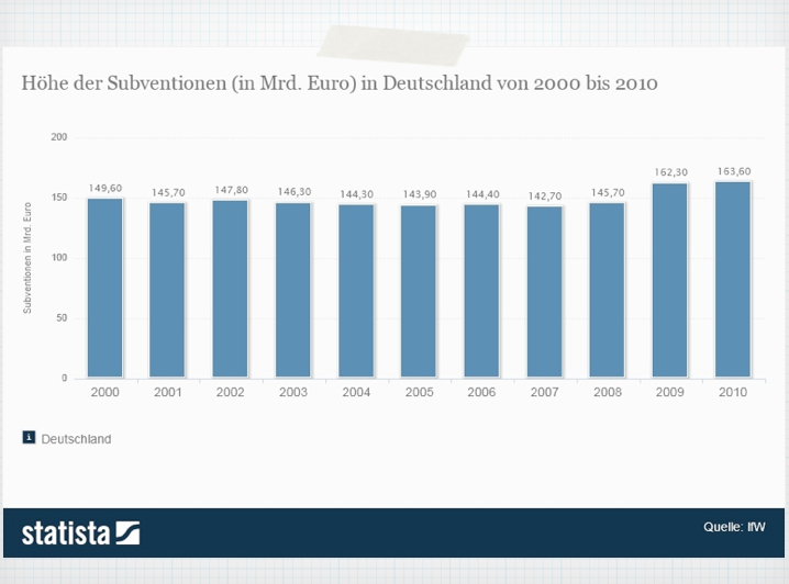 Wie hoch sind die Subventionen? Zuerst die Summe aller Subventionen. Die jüngsten Zahlen sind von 2010 und weisen eine Höhe von 163 Milliarden Euro auf.