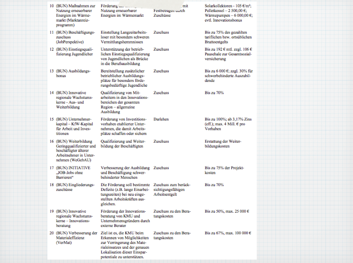 Der Subventionsbericht des IfW listet ein schönes Beispiel für den deutschen Subventionsdschungel auf. Die Wissenschaftler haben an einem Beispiel-Unternehmen (mittelständischer Maschinenbauer in Mecklenburg-Vorpommern) alle Fördermöglichkeiten zusammengesucht und aufgelistet.