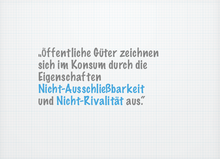 Das besondere an öffentlichen Gütern: Sie werden von den Menschen gewünscht, aber ohne staatliche Bereitstellung würde es sie nicht geben. Obwohl es Bedarf gibt, entsteht kein Angebot. Es herrscht Marktversagen. Zwei Kriterien machen öffentliche Güter aus: “Öffentliche Güter zeichnen sich im Konsum durch die Eigenschaften Nicht-Ausschließbarkeit und Nicht-Rivalität aus.“
