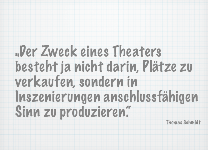 Ein passender Satz von Thomas Schmidt in der Zeit: „Der Zweck eines Theaters besteht ja nicht darin, Plätze zu verkaufen, sondern in Inszenierungen anschlussfähigen Sinn zu produzieren.“