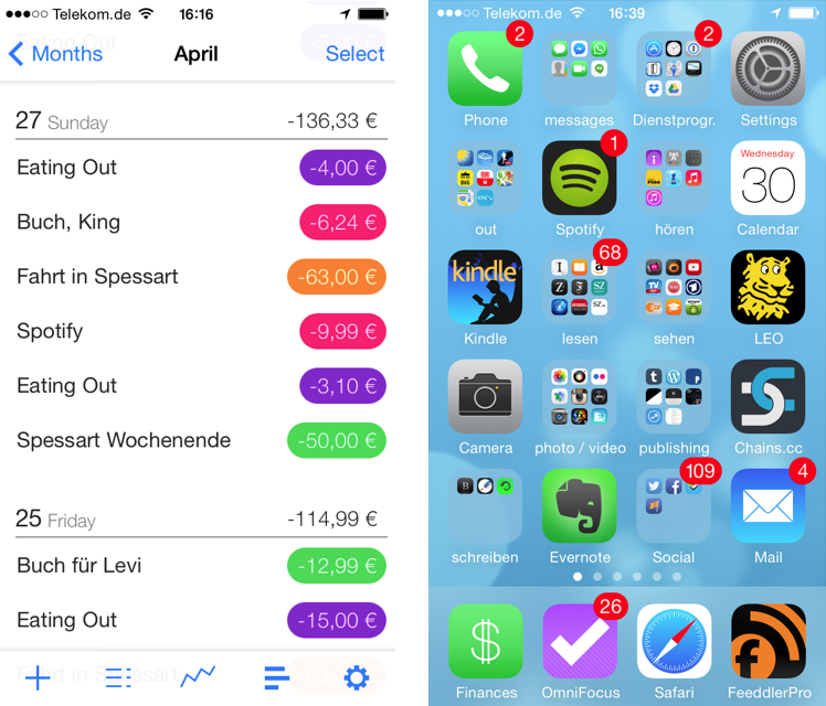 Mein Tracking-Werkzeug ist die iOS-App My Finances. Sie hat den prominentesten Platz auf meinem iPhone (Startbildschirm, unten links) und ich tracke darin (seit ungefähr zwei Monaten – und hoffentlich noch lange) alle Ausgaben.