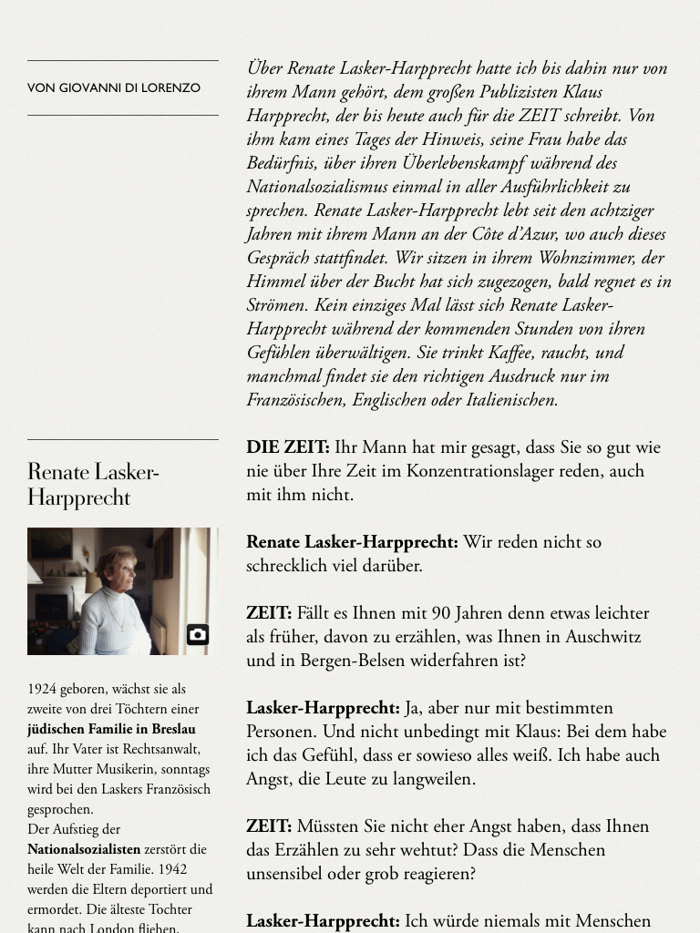 Und das Interview ist noch keine zwei Fragen alt, da bringt der Chefredakteur auch noch unter, dass vermutlich nur er dieses Interview hatte führen können. Wenn er nämlich Renate Lasker-Harpprecht fragt, ob es ihr mit 90 Jahren leichter falle, über Auschwitz zu sprechen und sie antwortet:
