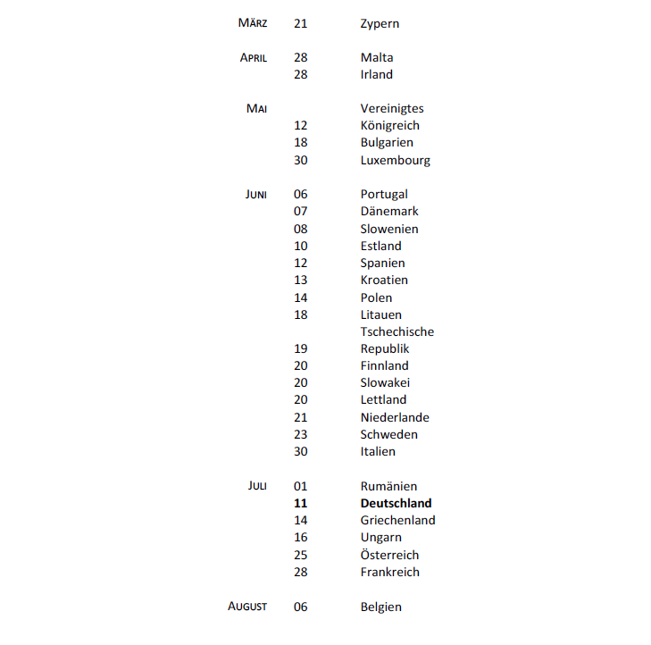 Auch anschaulich in der Studie: der in Deutschland bekannt Steuerzahlergedenktag als Kalender für den europäischen Vergleich: