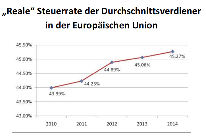 “Für den typischen Durchschnittsverdiener in der EU steigt die ‘reale Steuerrate’ Jahr für Jahr, von 45,06 Prozent im Jahre 2013 auf 45,27 Prozent im Jahr 2014. Damit setzt sich ein Trend fort, der seit dem Beginn der Studienreihe 2010 festzustellen ist. Der Anstieg um 1,28 Prozent seit 2010 ist zum großen Teil auf den Anstieg der Mehrwertsteuer in 19 EU-Staaten zurückzuführen.”