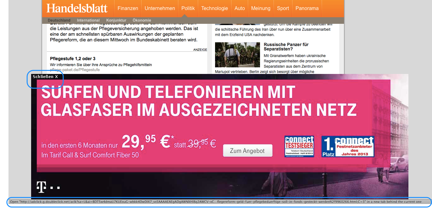 Eine Anzeige auf Handelsblatt.com, die sich über ein Viertel des Browserfensters legt….