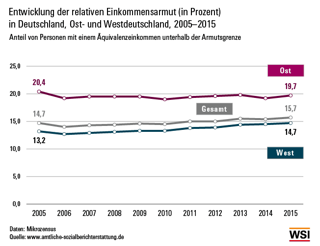 Denn nachweislich ist die Aufnahme einer Beschäftigung der sicherste Weg, die Armutsgefährdung hinter sich zu lassen. Warum schlägt sich dieser individuell nachweisbare Effekt zumindest auf den ersten Blick nicht in einer Reduzierung der relativen Armut nieder?