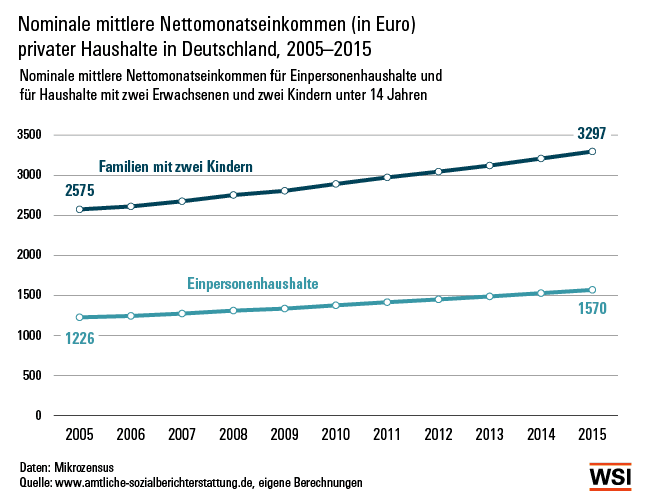 - Die Messungen von Armut orientiert sich am Haushaltseinkommen. Da es eine Tendenz zu weniger Haushaltsmitgliedern gibt (leichte Zunahme der Alleinerziehenden-Haushalte, deutliche Zunahme der Singles), reduziert dies tendenziell die Haushaltseinkommen.