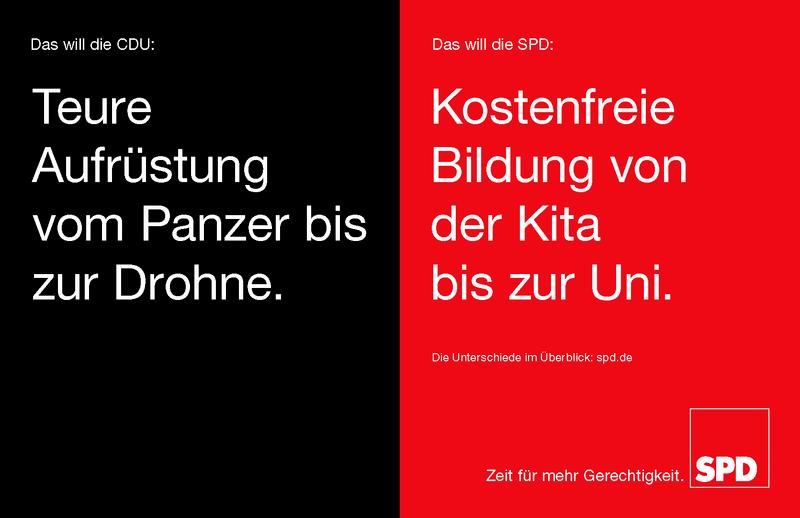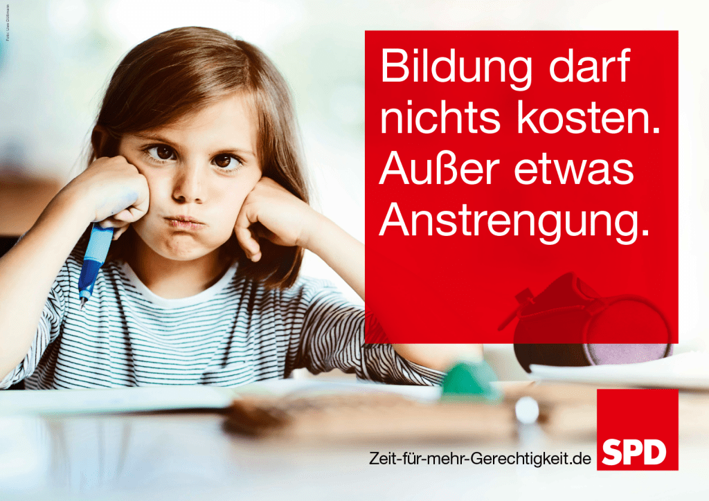 Auf diese Fragen geben die Plakate keine Antworten. Wäre vielleicht für plakative Botschaften auch zu viel verlangt. Wer allerdings so tut, als wäre Bildung kostenfrei, der kann diese Fragen erst gar nicht stellen. Was nichts kostet, muss auch nicht bezahlt werden. Diese Illusion aber ist ein Problem für die SPD. Denn die Fragen sind Gerechtigkeitsfragen. Wer sich vor ihnen drückt, bekommt gesellschaftliche Ergebnisse, die konträr zu gängigen Gerechtigkeitsvorstellungen stehen, etwa insofern, dass dann staatliche Umverteilung von unten nach oben stattfindet. Das wird kaum einer wollen. Schon gar nicht Sozialdemokraten.