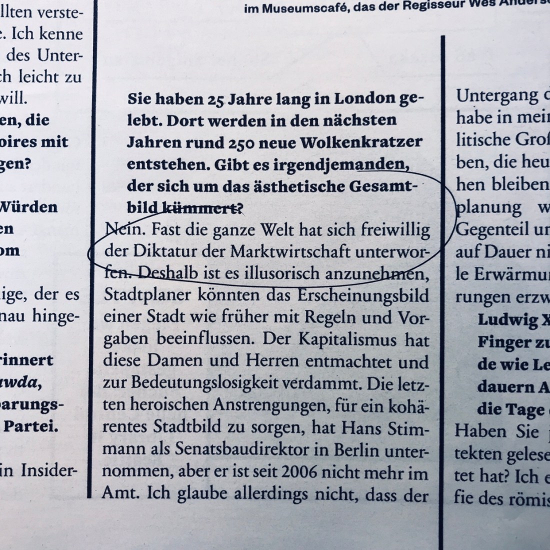 Warum sollte sich eine Stadt nicht Regeln guten Bauens geben und diese nicht durchsetzen können? Vielleicht kapier ich‘s auch nur nicht. Das SZ-Interview jedenfalls hat mich diesbezüglich nicht schlauer gemacht.