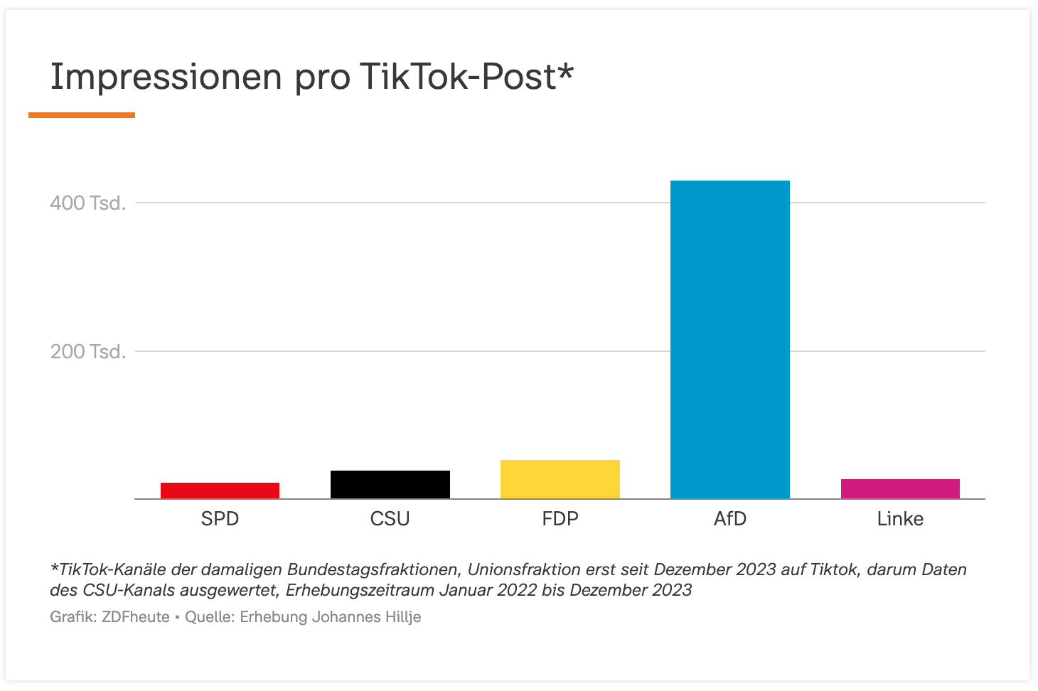 Auf TikTok werden AfD-Videos dreimal so häufig aufgerufen wie die Videos aller anderen Parteien zusammen. Ähnlich drepremierend sieht es bei Facebook und Youtube aus. “Tatsächlich dürfte der AfD-Vorsprung vor den anderen Parteien noch deutlich größer sein. Denn die Partei setzt wie kaum eine andere auf ein Netzwerk an Unterstützer-Accounts, die Partei-Inhalte in eigene Videos packen und mit reißerischen Titeln verbreiten”, schreibt ZDF-Heute, das Zahlen des Politikberaters Dr. Johannes Hillje veröffentlicht hat.