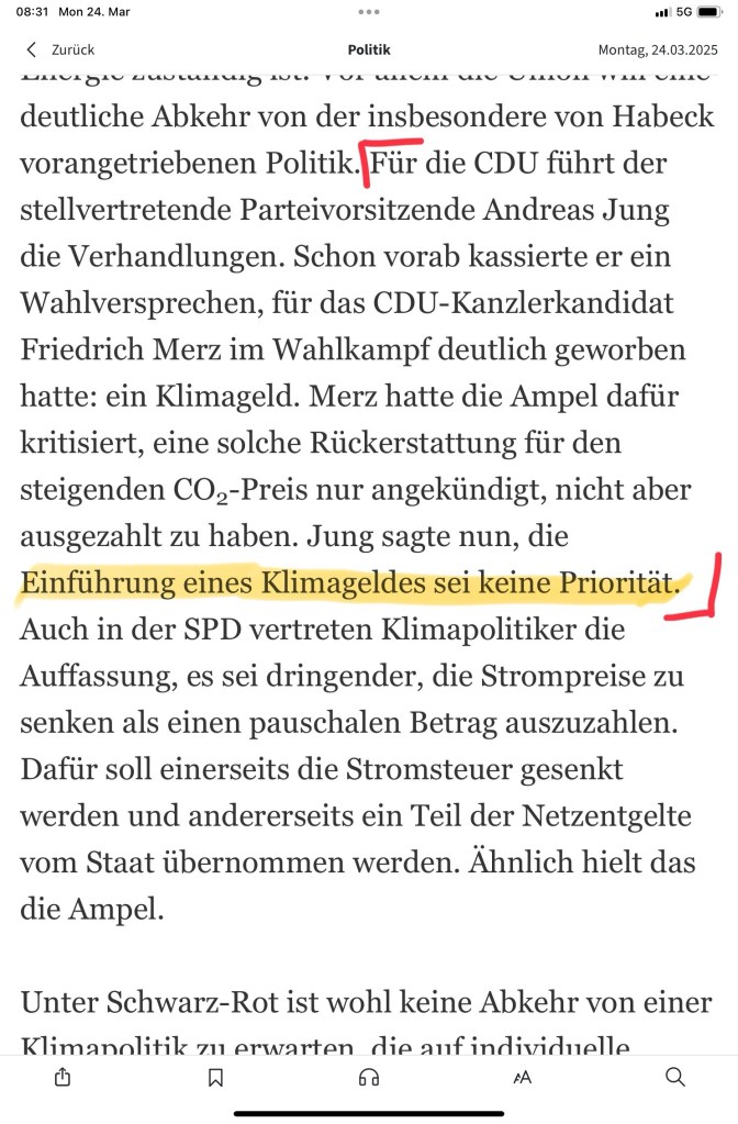 Es ist vielleicht das beste Instrument für die Akzeptanz von Klimapolitik: das Klimageld. Denn es macht deutlich, dass steigende Preise für fossile Energie vor allem eines sind: ein Lenkungsinstrument für mehr Klimaschutz, nicht eine weitere Einnahmequelle des Staates. Denn mit dem Klimageld gibt der Staat, was er nimmt, wieder seinen Bürger:innen zurück. Und zwar am besten vollständig. Die CDU hatte im Wahlkampf für das Klimageld geworben. Es wird wohl dennoch nicht kommen (siehe heutige FAZ). Warum? Politik verteilt staatliche Einnahmen lieber nach politischen Motiven. Vornehmlich an ihr Klientel. Die Akzeptanz für den Klimaschutz wird so nicht erhöht. Und ohne Akzeptanz gibt es nicht genügend Klimaschutz. Das ist nicht nur schlecht für unser Klima, somdern wird auch jenen Kräfte in unserer Gesellschaft weiter stärken, die von Demokratie wenig halten.